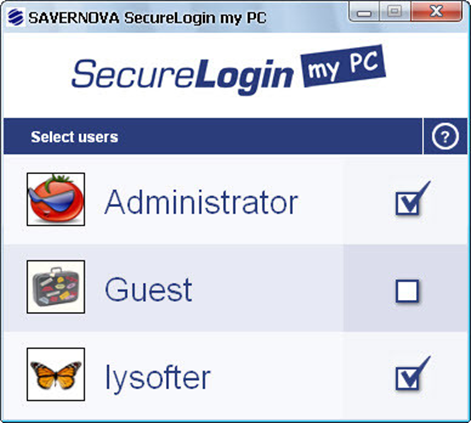 SecureLogin my PC运行需要Microsoft.NetFramework 2.0以上组件的支持,而且它只支持Windows2000/XP操作系统。当其初次运行后,在其主窗口中会列出所有的Windows账户,勾选您所需的账户名(本例为“lysofter”),表示为该其添加动态登录密码功能。之后点击“Ctrl+Alt+Delete”键,SecureLogin my PC会提示您重新启动系统。之后SecureLogin my PC接管了Windows的登录管理机制,在启动过程中,会自动弹出SecureLogin my PC认证界面,在其中选择上述账户名称,。