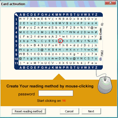 在上述导界面中可以看到,SecureLogin my PC可以随机选择起点字符位置,我们不妨将其成为“锚点”。您可以以该锚点为起点。灵活的配置所需的密码排列循序。例如本例中锚点坐标为N6,其对应的字符为“g”。为了简单起见,我们设定密码为5位,采用的排列顺序为从锚点开始,向其右侧横向每隔一个坐标点选择一个字符,来组成登录密码。这里选择的坐标点依次为R6,T6,V6,X6,其对应的字符为“=”,“+”,“y”,“%”,表示我们选择的密码为“g=+y%”。